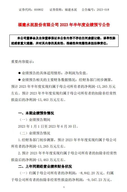 福建水泥7月11日公告,預計2023年上半年凈虧1.33億元。受市場需求持續偏弱影響,水泥價格不斷走低,報告期公司水泥平均售價同比下降7.86%,銷量較上年同期減少7.4%,導致本期經營業績出現虧損。