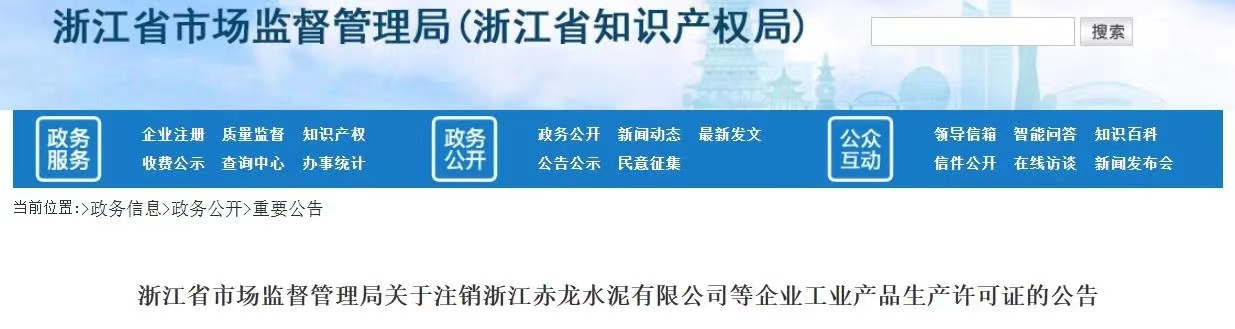 近日,浙江省市場監督管理局發布關于注銷浙江赤龍水泥有限公司等企業工業產品生產許可證的公告。