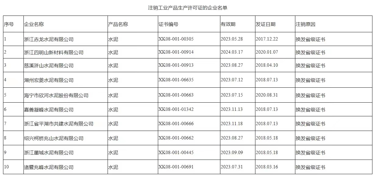 其中包括十家水泥企業,注銷原因均為換發省級證書: