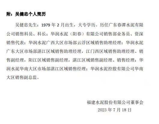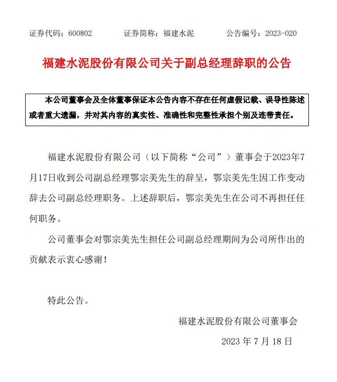 福建水泥公告,公司董事會收到公司副總經(jīng)理鄂宗美的辭呈,鄂宗美因工作變動辭去公司副總經(jīng)理職務(wù)。上述辭職后,鄂宗美在公司不再擔(dān)任任何職務(wù)。同日公告經(jīng)控股股東推薦,董事會提名委員會審查通過,同意聘任吳健忠先生為公司副總經(jīng)理。